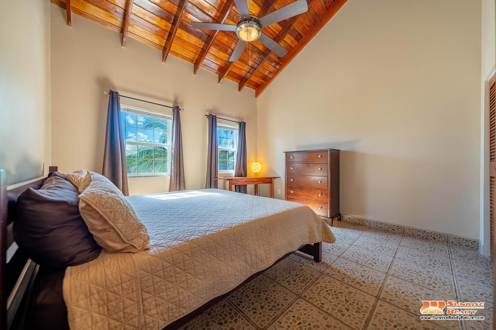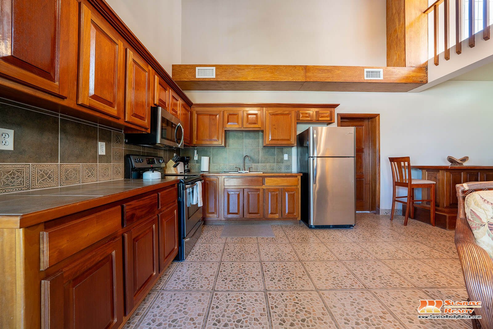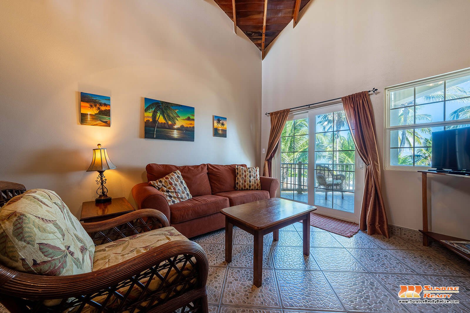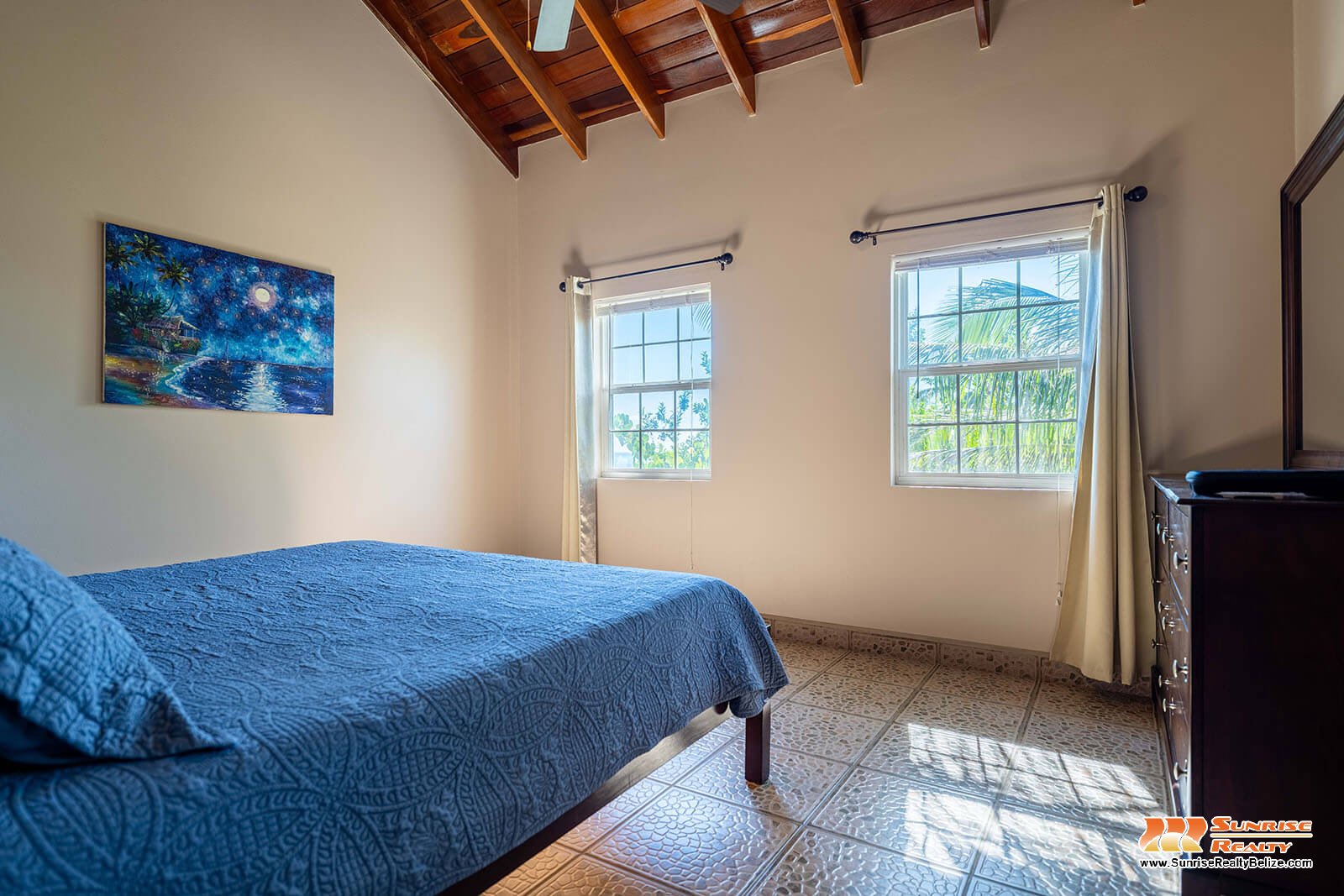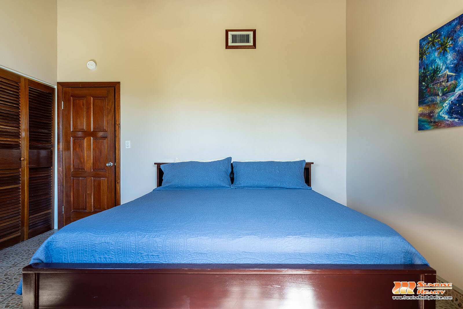 The condo is on the second level and enters into the living room with immediate views of the Caribbean Sea. The dining area has a high table with dining for six situated right across from the living area and kitchen. The well appointed kitchen features stainless steel appliances and custom Belizean hardwood cabinetry and is open to the living/dining area of the home. The large master bedroom boasts a custom built king size bed with matching nightstands and dresser. The master bathroom is equipped with a walk-in shower and double sink vanity, and a jacuzzi. The second bedroom has a large queen bed, closet and has easy  access to bathroom.
