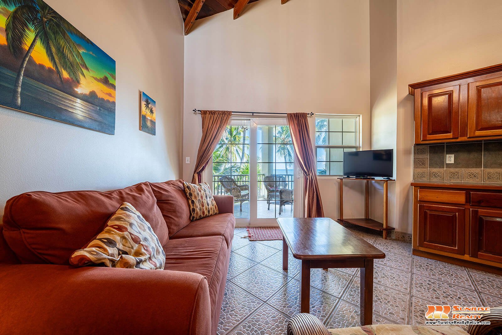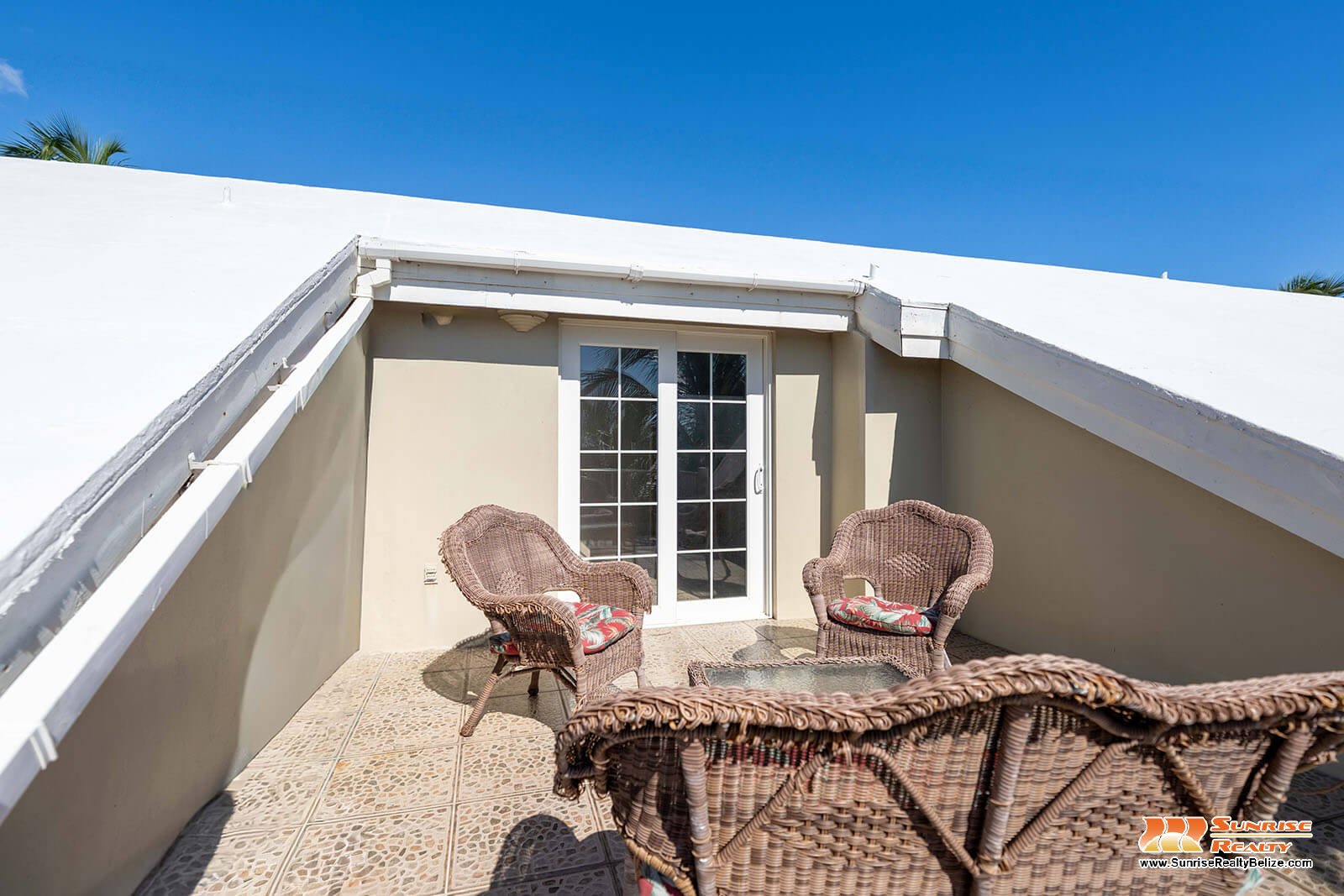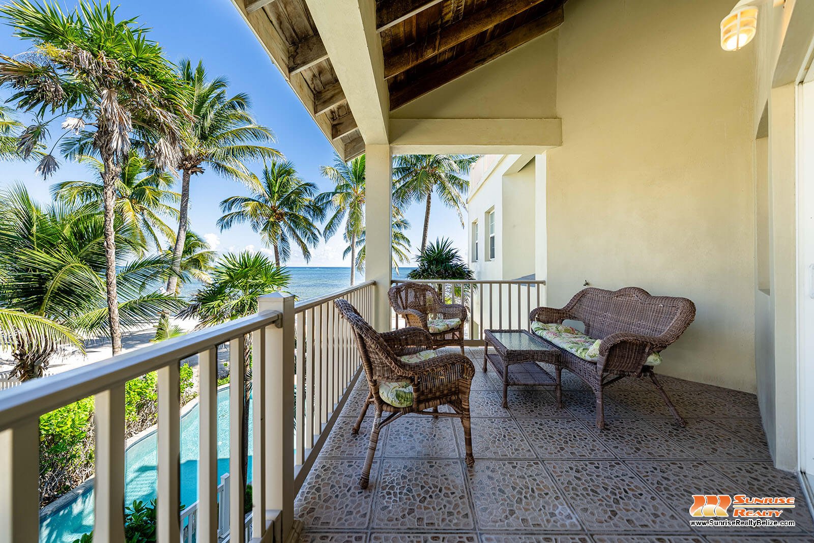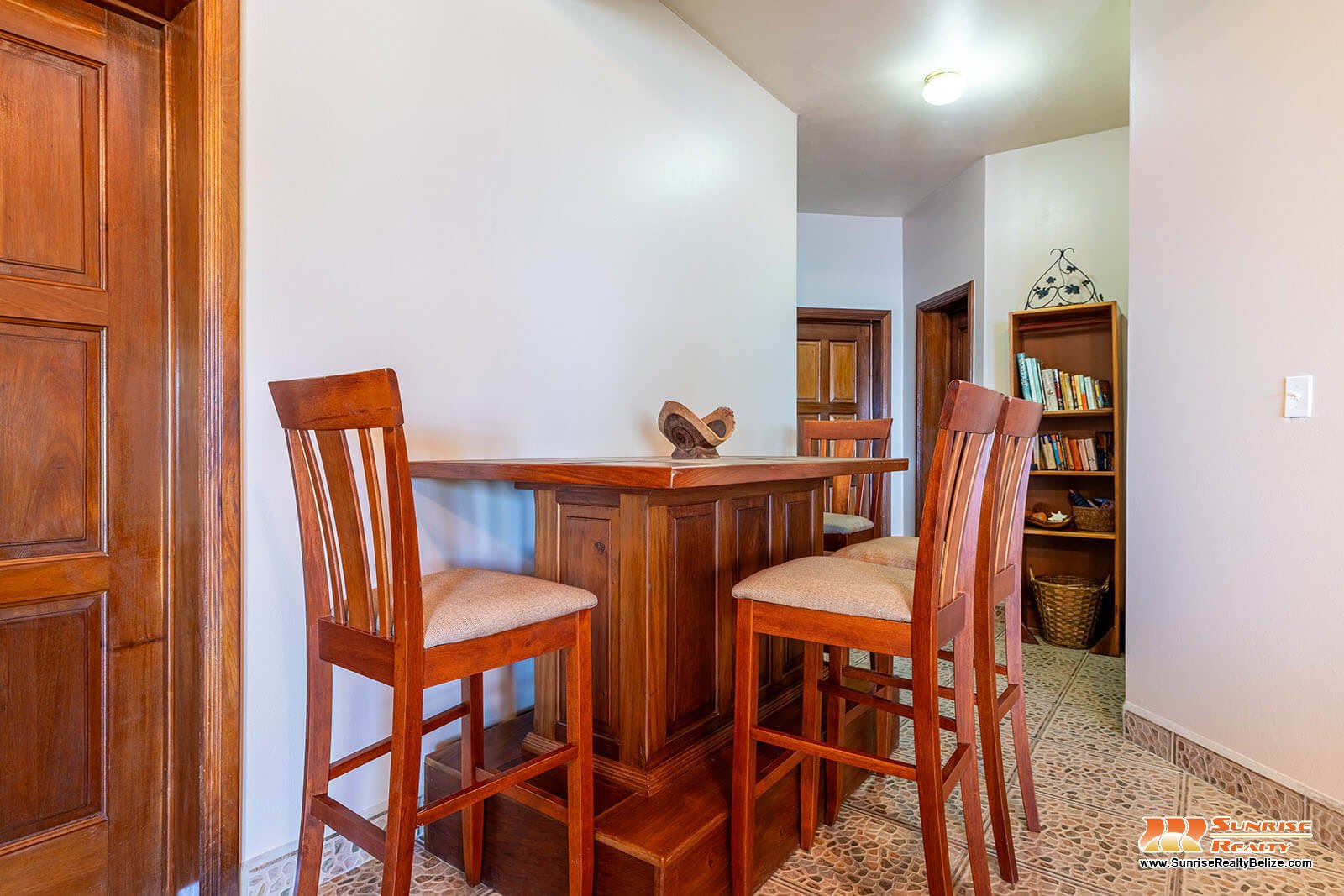 The condo is on the second level and enters into the living room with immediate views of the Caribbean Sea. The dining area has a high table with dining for six situated right across from the living area and kitchen. The well appointed kitchen features stainless steel appliances and custom Belizean hardwood cabinetry and is open to the living/dining area of the home. The large master bedroom boasts a custom built king size bed with matching nightstands and dresser. The master bathroom is equipped with a walk-in shower and double sink vanity, and a jacuzzi. The second bedroom has a large queen bed, closet and has easy  access to bathroom.