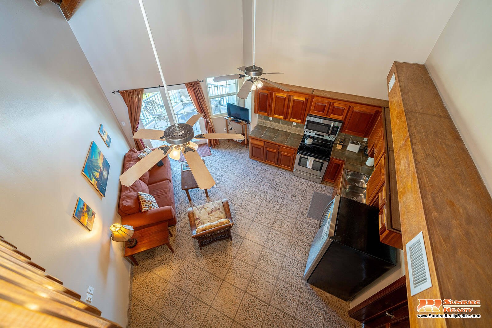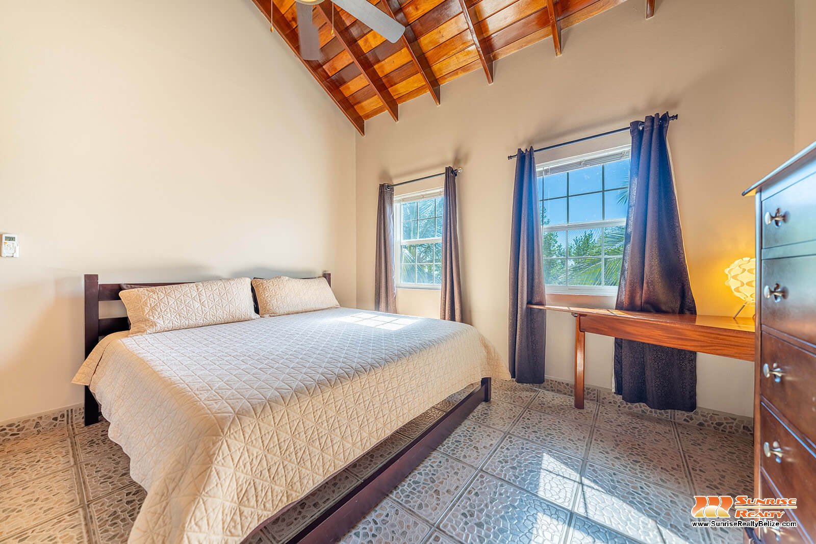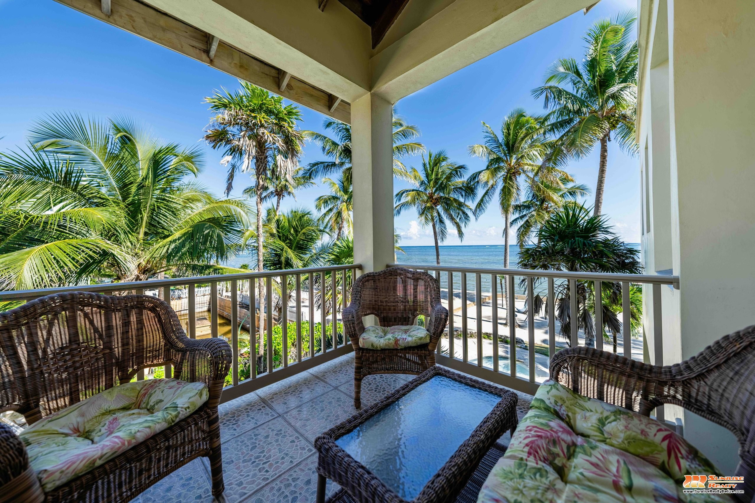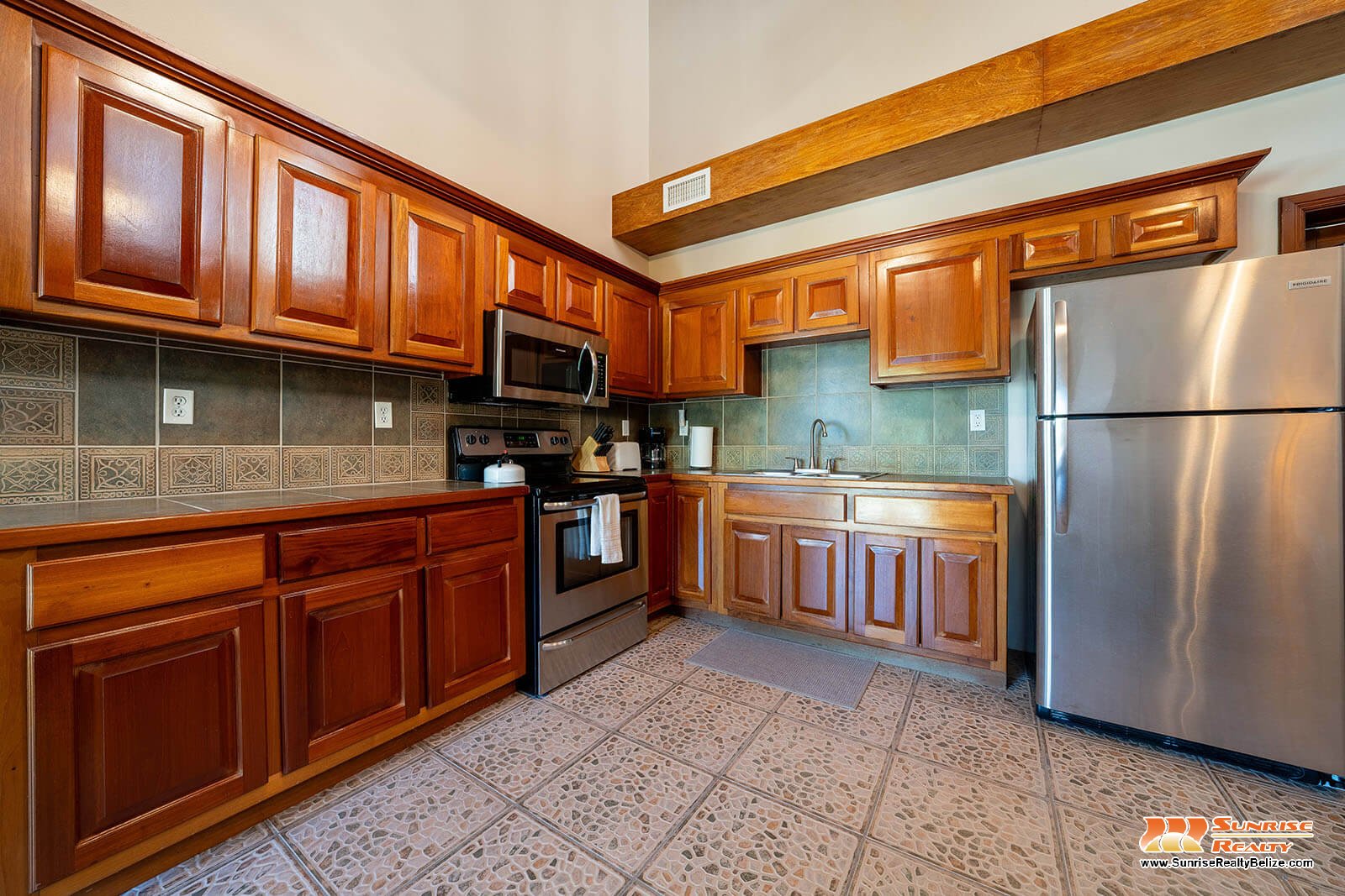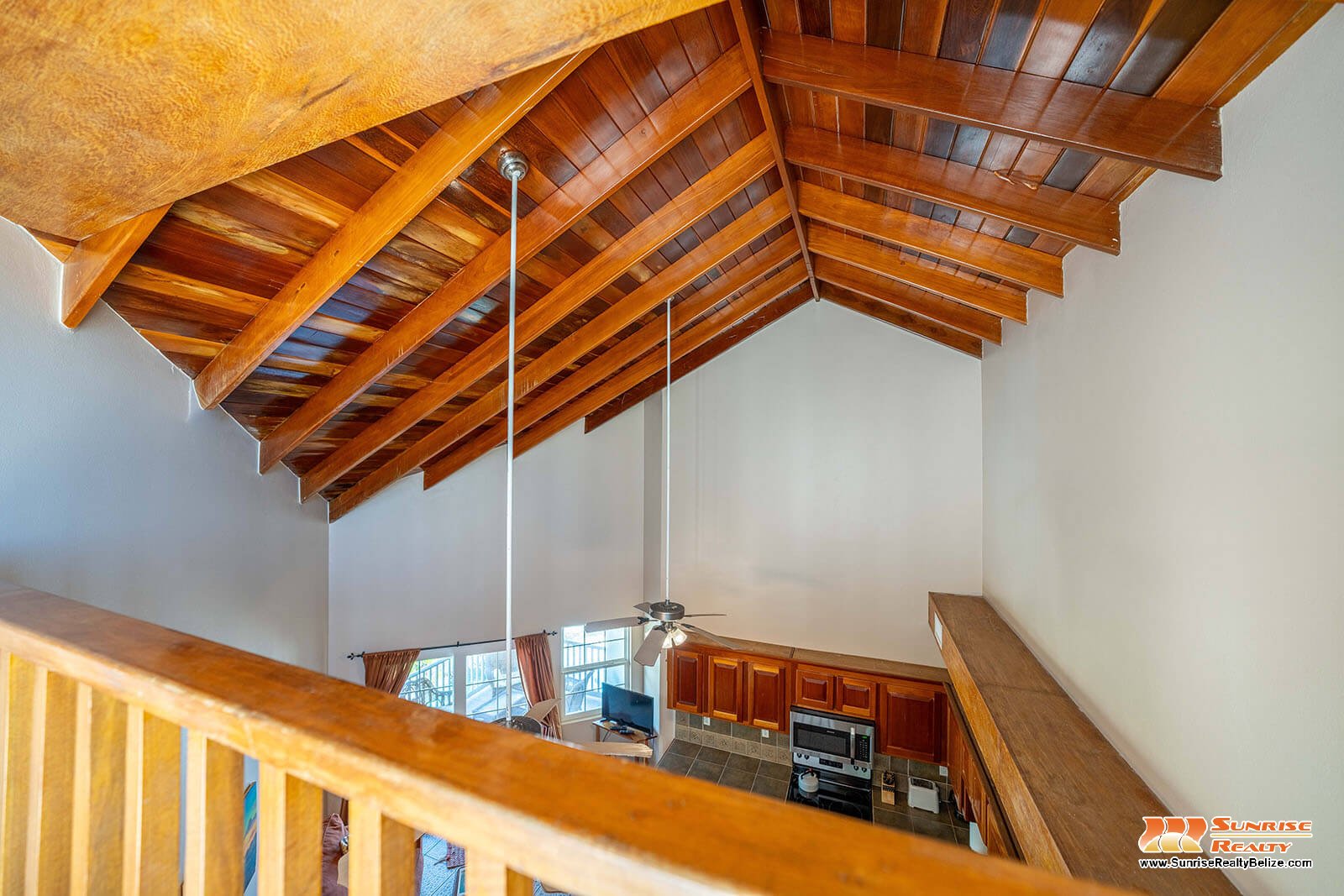 The condo is on the second level and enters into the living room with immediate views of the Caribbean Sea. The dining area has a high table with dining for six situated right across from the living area and kitchen. The well appointed kitchen features stainless steel appliances and custom Belizean hardwood cabinetry and is open to the living/dining area of the home. The large master bedroom boasts a custom built king size bed with matching nightstands and dresser. The master bathroom is equipped with a walk-in shower and double sink vanity, and a jacuzzi. The second bedroom has a large queen bed, closet and has easy  access to bathroom.