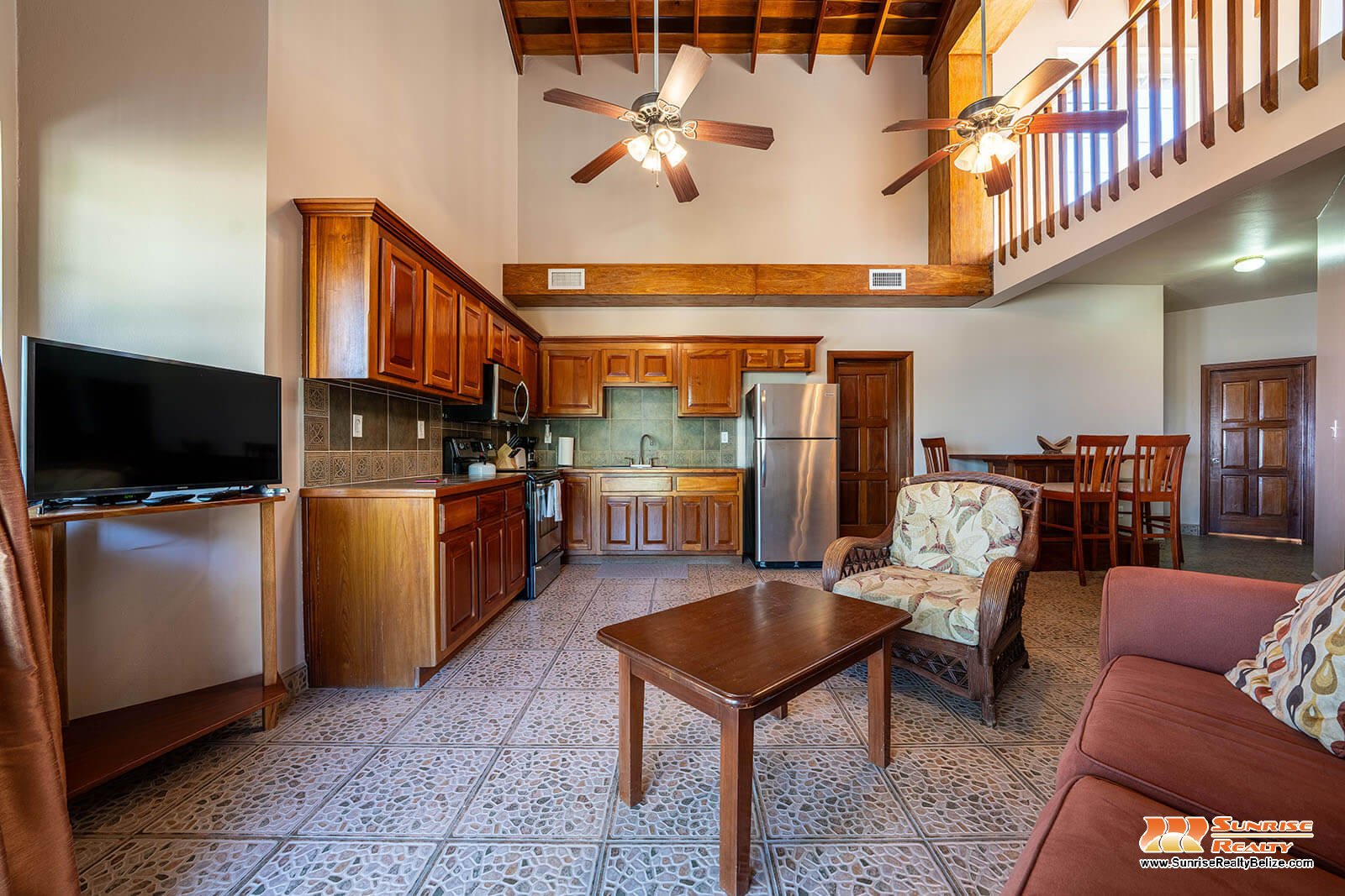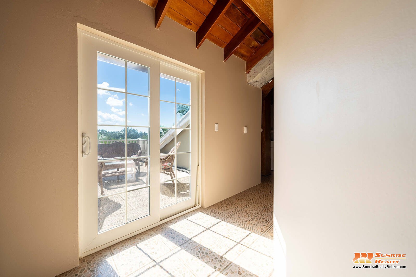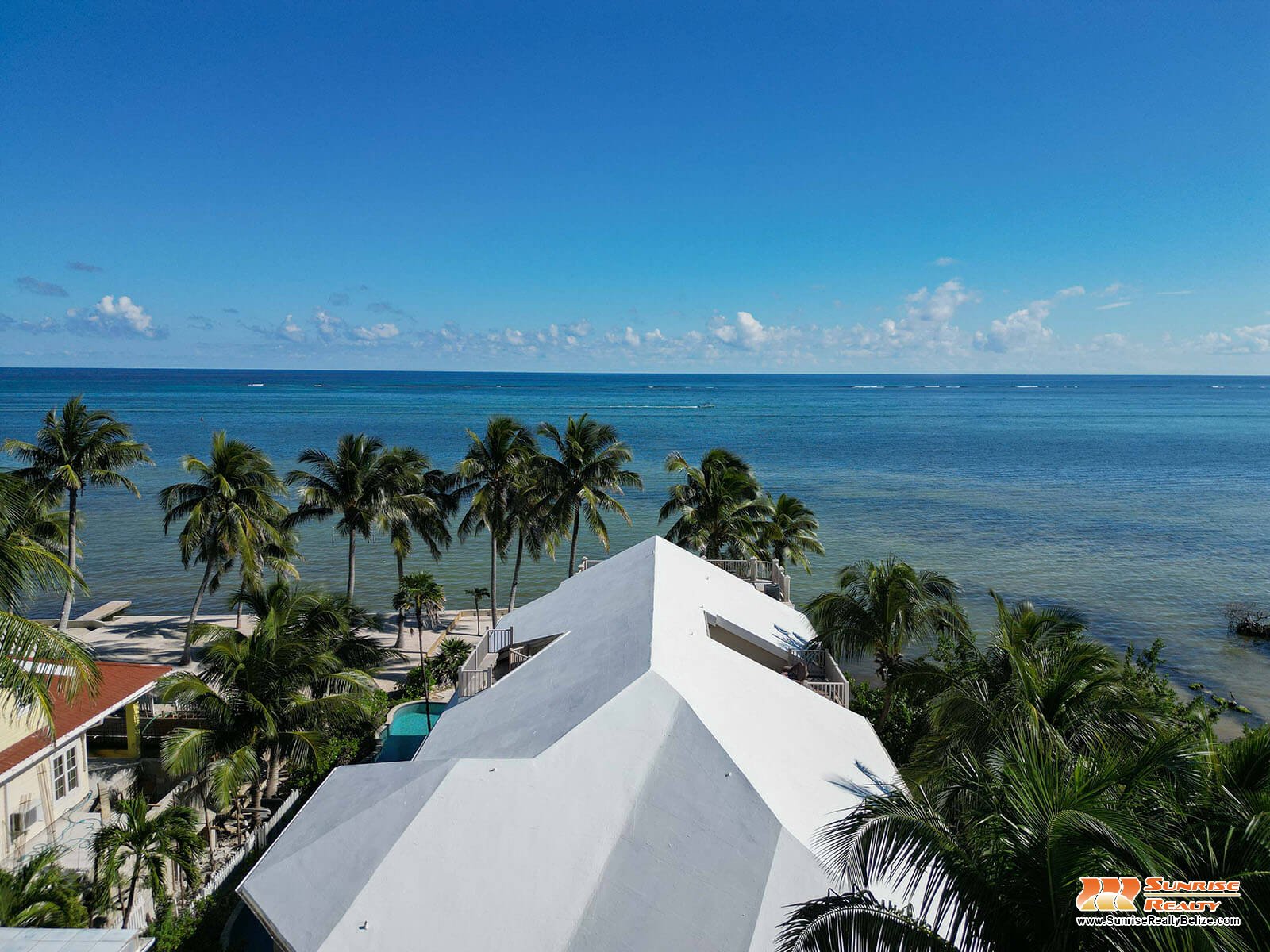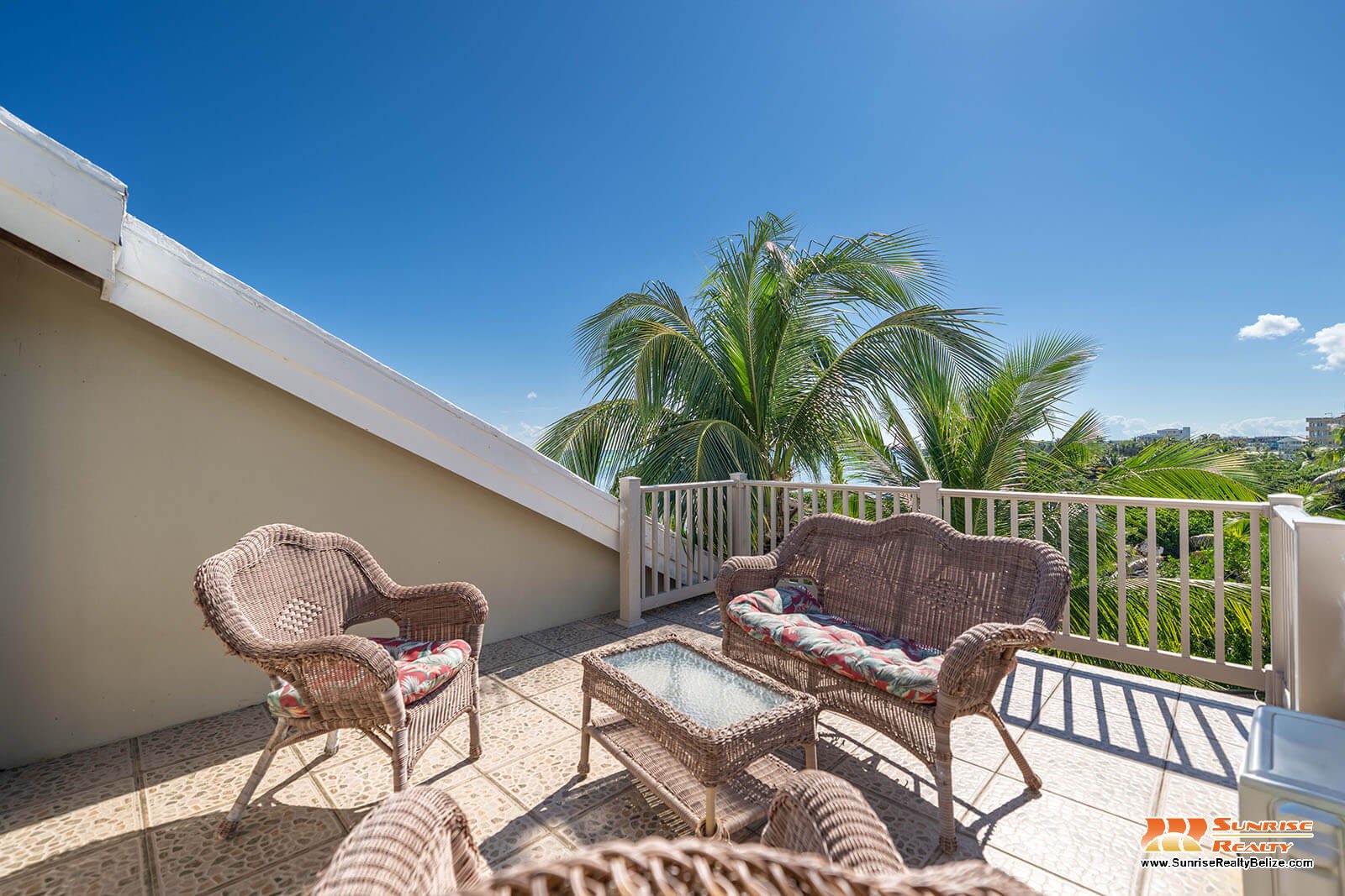 The condo is on the second level and enters into the living room with immediate views of the Caribbean Sea. The dining area has a high table with dining for six situated right across from the living area and kitchen. The well appointed kitchen features stainless steel appliances and custom Belizean hardwood cabinetry and is open to the living/dining area of the home. The large master bedroom boasts a custom built king size bed with matching nightstands and dresser. The master bathroom is equipped with a walk-in shower and double sink vanity, and a jacuzzi. The second bedroom has a large queen bed, closet and has easy  access to bathroom.