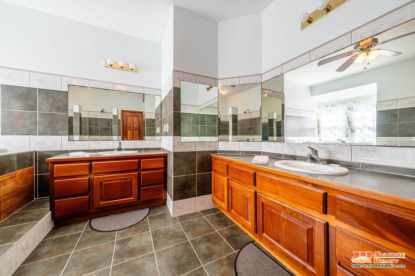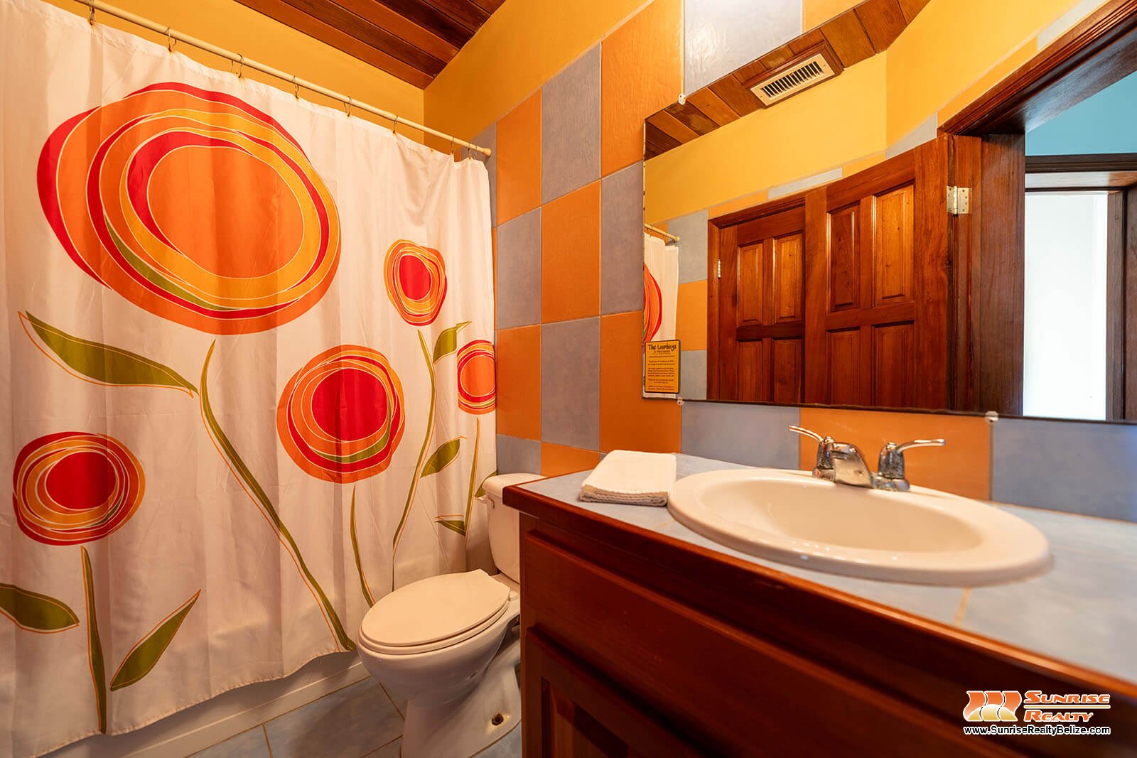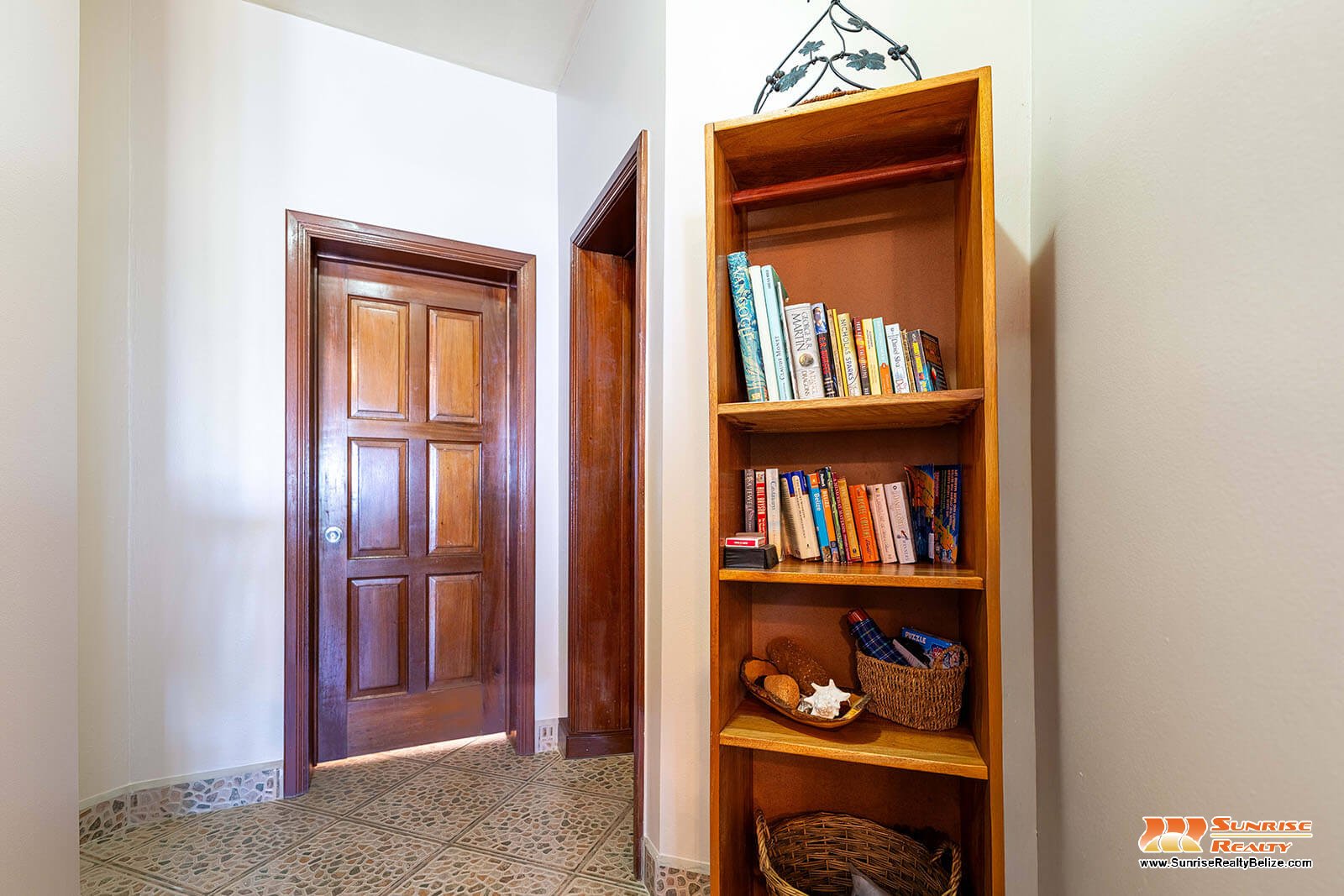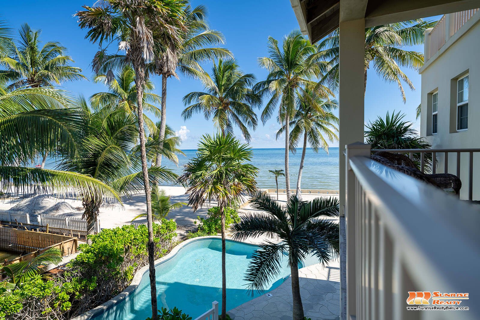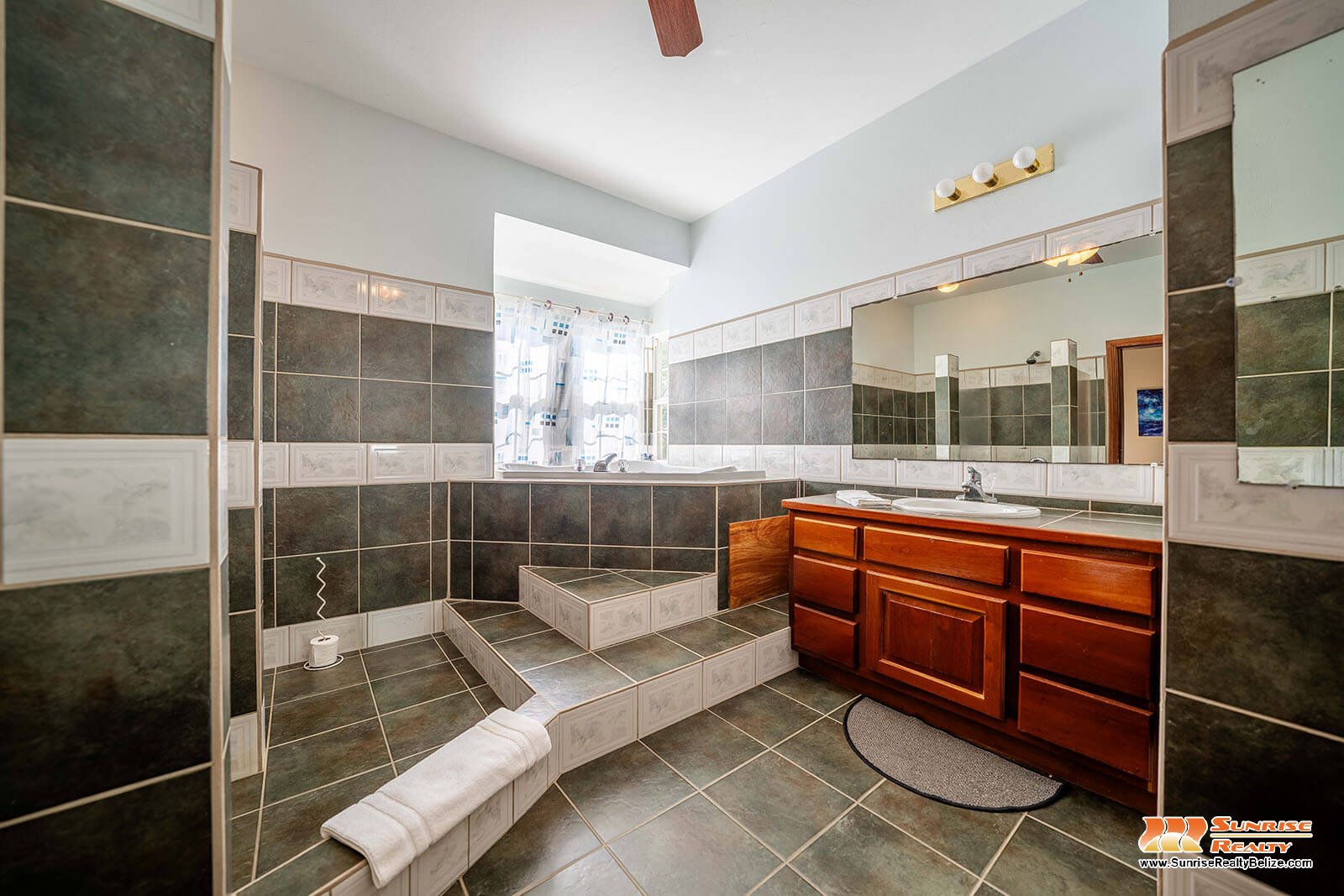 The condo is on the second level and enters into the living room with immediate views of the Caribbean Sea. The dining area has a high table with dining for six situated right across from the living area and kitchen. The well appointed kitchen features stainless steel appliances and custom Belizean hardwood cabinetry and is open to the living/dining area of the home. The large master bedroom boasts a custom built king size bed with matching nightstands and dresser. The master bathroom is equipped with a walk-in shower and double sink vanity, and a jacuzzi. The second bedroom has a large queen bed, closet and has easy  access to bathroom.
