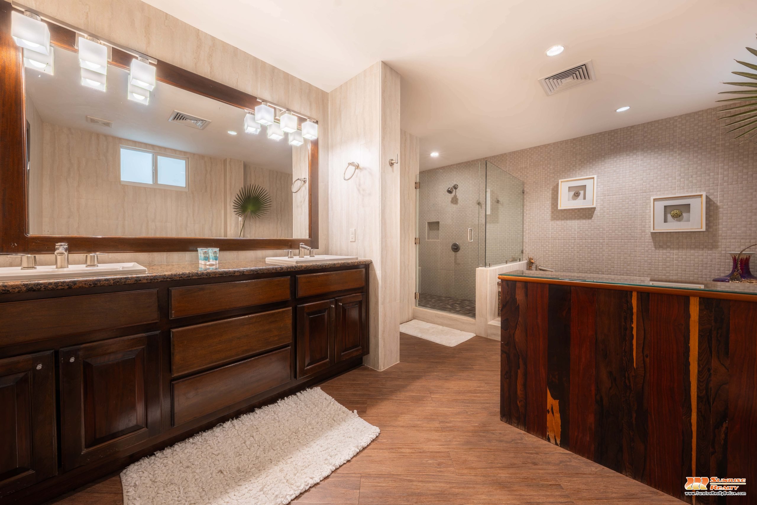 The two additional double sized bedrooms overlooking the courtyard gardens and a fresh water lap pool are bright, spacious and each have full en-suite bathrooms and walk-in closets. These two bedrooms offer ample closet space for an owner’s lock off storage area as well as plenty of room to accommodate guests.